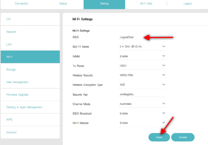 After that, you will get your default dashboard where you have to click on “Setting” and then the WiFi button; Now the first option will be for SSID, Here you can see My SSID is LogicalDost.
