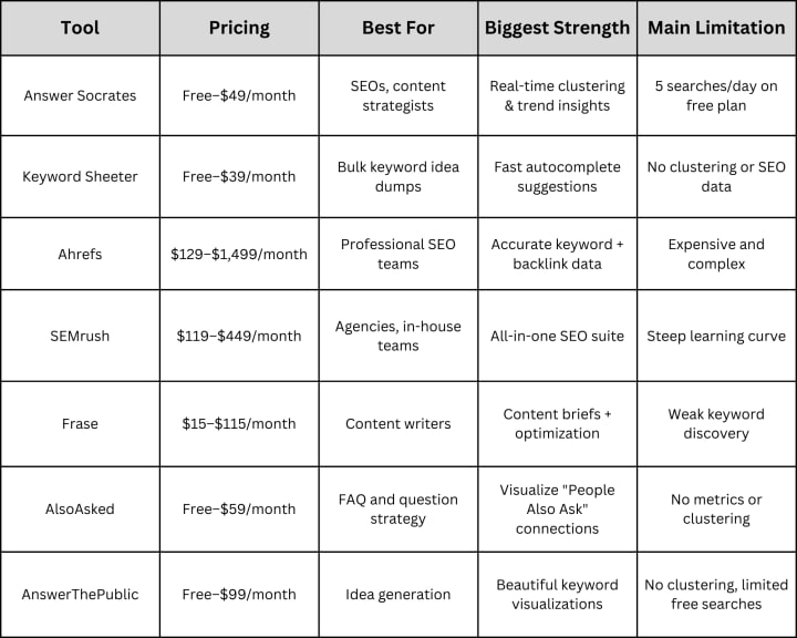 ✅ If you want the best mix of usability, keyword coverage, and clustering power — Answer Socrates is your winner.