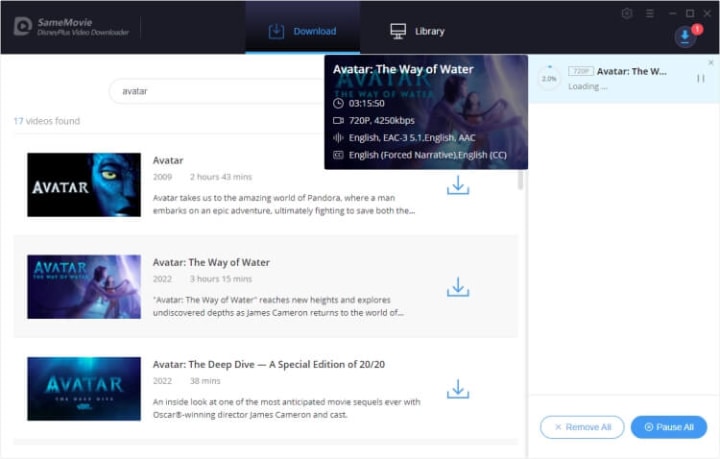 SameMovie DisneyPlus Video Downloader is an app that can download Avatar: The Way of Water as MP4/MKV file. Therefore, you can keep it forever, and transfer it to your other devices freely if needed. With this program, you can preserve multilingual subtitles and audio tracks with this tool as well. Besides, you can download videos at a very fast speed. If you need to download TV series or several movies at once, you could experience downloading videos in batches in SameMovie.