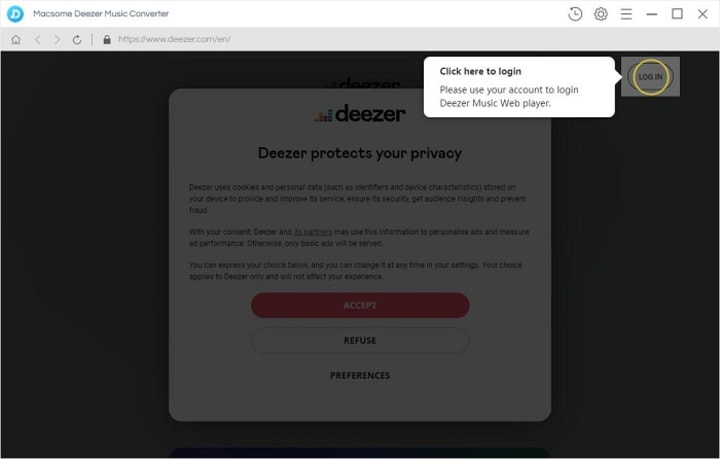 Once the program starts, you have access to the Deezer Web Player by clicking the "Open Deezer Web Player" button on the main interface. Then log into your Deezer account.