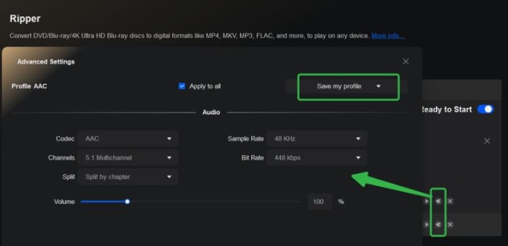 Step 5: Adjust the codec, channels, sample rate, and bit rate if needed in the Advanced Settings panel. Split the title into chapters is also supported, simply choose the option per your need. After making the changes, if you want to save the parameters for future use, click the "Save my profile" button in the top-right corner.