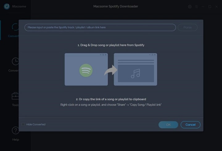Search the songs or playlists you would like to download, then drag them to the adding window. Moreover, you can also copy and paste the link to the song or playlist. Hit the "OK" button, and the tracks will be loaded to the main window.