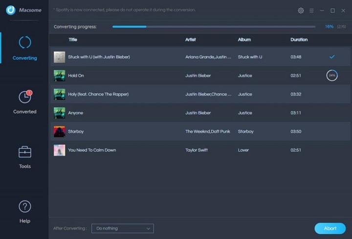 Click the "Convert" button, Macsome will immediately download all Spotify songs to local files in the common format you set before.