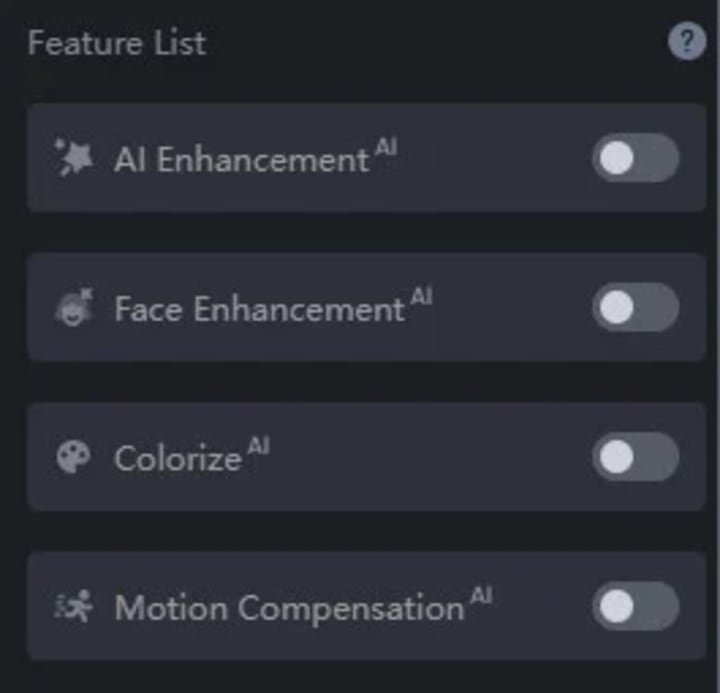 After uploading the video, you need to choose your desired AI capabilities. The Feature List section shows all the AI features available in AVCLabs Video Enhancer AI including AI Enhancement, Face Enhancement, Colorize, and Motion Compensation.