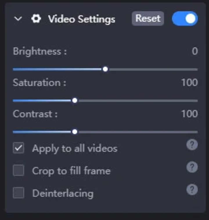 Video Settings: Under this section, you can adjust the brightness, saturation, and contrast of videos. If you upload multiple videos, these settings will apply to all videos by default to save time, while of course, you can uncheck this option if you don’t want this. In addition, there are also options like cropping to fill the frame and deinterlacing.