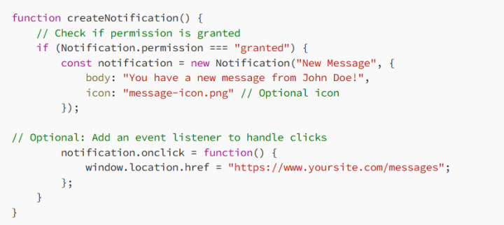 Once the user grants permission, you can display a notification using the Notification constructor. A simple notification can include a title, body, and icon. Here’s an example: