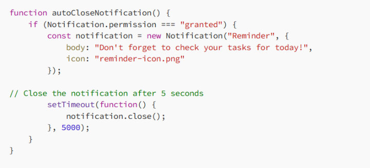 Web notifications don’t just disappear after a few seconds. You can control when they should be dismissed or remain visible. For example, you can set a timeout to automatically close the notification after a specific time interval.