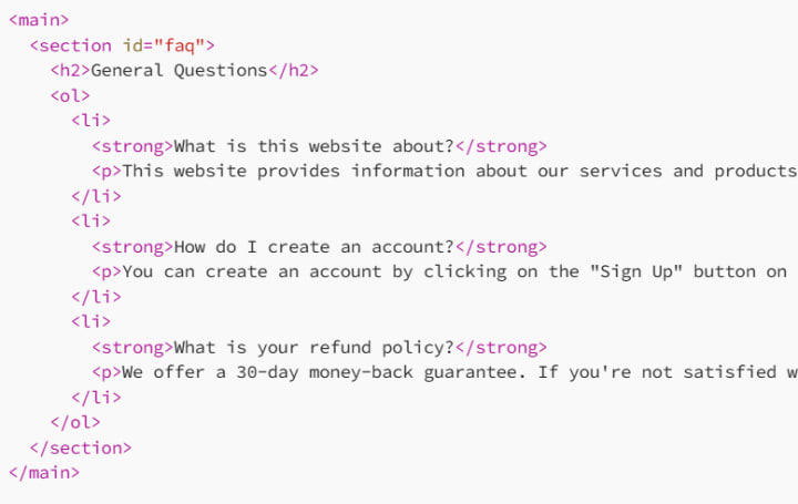 Next, let’s add the questions and answers to the page. We’ll use an ordered list <ol> to organize the FAQ questions and <li> tags for each item. This structure will allow us to easily add more questions and answers later.