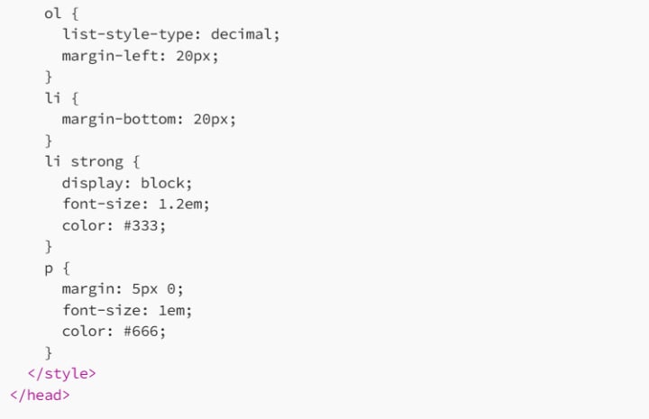 To make the FAQ page more visually appealing, let’s add some basic CSS styles. We will style the page header, list items, and questions. For this, we’ll include a <style> block in the <head> section of the document.