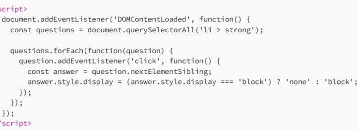The script listens for clicks on the <strong> elements (which contain the questions).
