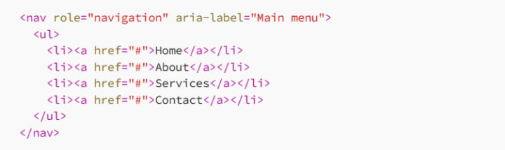 A common challenge for users with disabilities is navigating complex menus or site navigation. By adding role="navigation" to a navigation section and using aria-label for clarity, we can help assistive technologies interpret the menu structure.