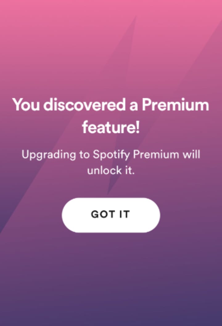 For those of you not in the know, this is one of the in-product messages a Spotify user gets when trying to "use" a premium feature, such as skip an ad or filter through a playlist.