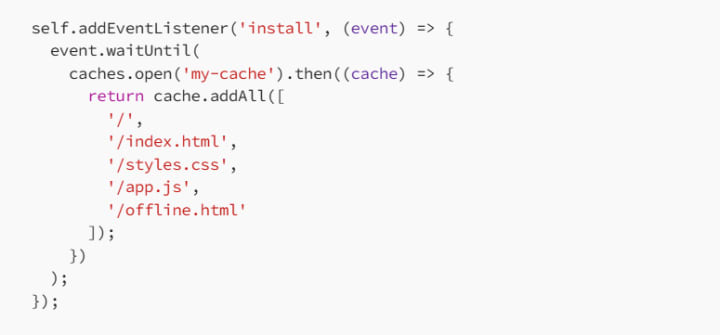 In this example, we open a cache named my-cache and add the files to it. These files will be available to your users even when they are offline.
