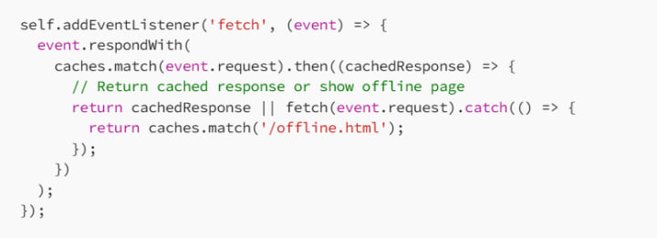 In this case, if the user is offline and a network request fails, they will see the offline.html page.