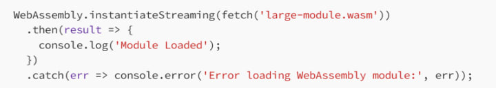 Compiling large WebAssembly modules can take time. Fortunately, WebAssembly supports asynchronous instantiation, which allows you to load and compile WebAssembly modules in the background while keeping your app responsive.