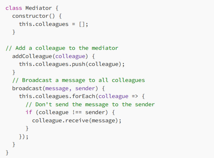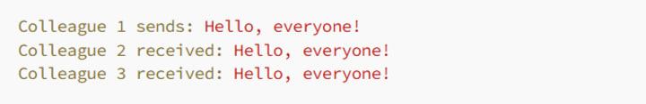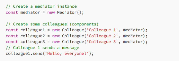 In this example, when colleague1 sends a message, the mediator broadcasts that message to the other colleagues (colleague2 and colleague3). The message is not sent back to the sender (colleague1), keeping the communication centralized.