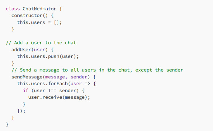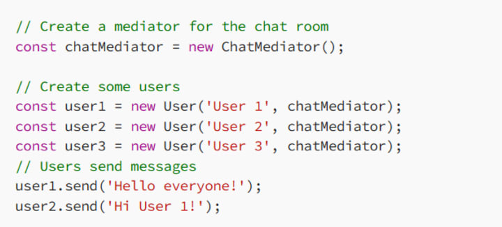 Let’s look at a more complex example where the Mediator Pattern can be applied: a chat system. In this case, the mediator will manage communication between users in a chat room.