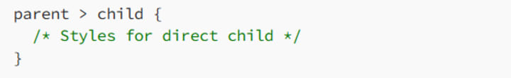 - Child combinator (>): Targets direct children of an element.
