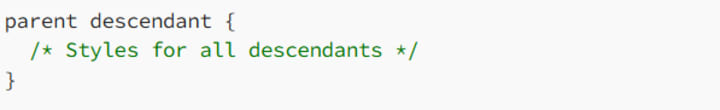 - Descendant combinator (space): Targets all descendants, regardless of how deep the hierarchy goes.