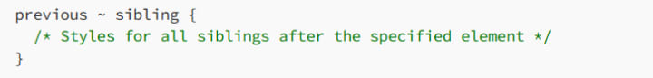 The general sibling combinator (~) is similar to the adjacent sibling combinator, but it’s a little more relaxed. Instead of selecting only the immediate next sibling, the general sibling combinator selects all elements that come after the first one, as long as they share the same parent.