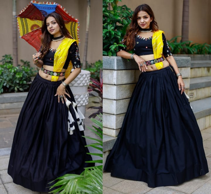 This Unique and Trendy Concept of Navratri Special Lehenga Choli for Women. Black Color Plain Chaniya with Mirror Work Blouse. Ghagra Choli Comes with Beautiful Mirror Work Waist Belt this make Unique of Navratri Outfits.