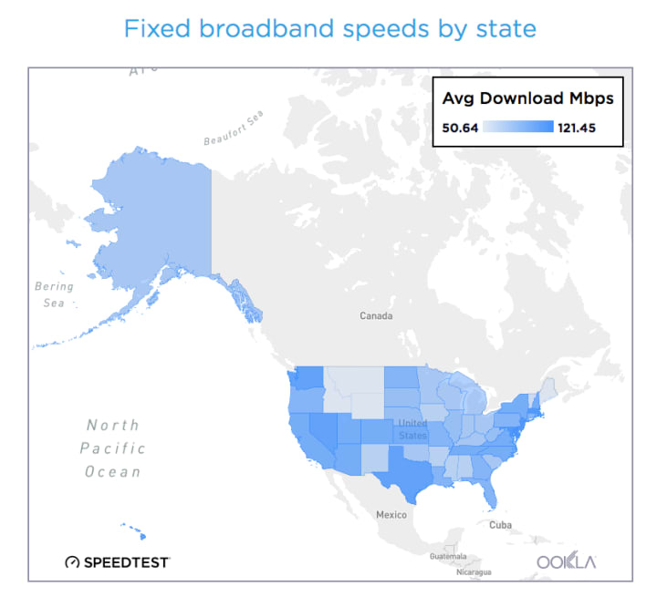 A recent, comprehensive analysis on the differences to be found across the United States in internet access—and specifically, on access speeds—was compiled by Speed Test. Now, if you have ever been on the phone trying to get help from your cable and/or internet provider's tech support, you are likely very familiar with their website. When one has a problem with their home or office internet connection and calls for customer service, after their representative/technician has you reboot your modem as "step one" of their playbook, normally "step two" in the diagnosis/"fixing it" process is to have you test the speed of your current connectivity through Speed Test's website. Now, what is interesting is that as happens in our modern tech age, all of these individual speed tests conducted to try and diagnose your particular problem—or just to see if you are getting the proper "value" from your provider—are then aggregated to form a very interesting—and very robust—data set.