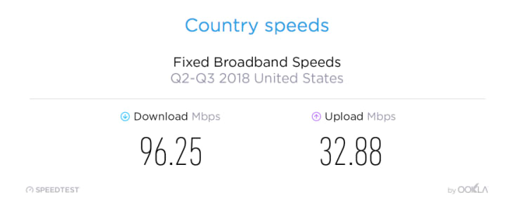 So, let's start with the numbers. The average internet download speed across the U.S. stood at just over 96 Mbps (Megabits per second), while the overall upload speed (always a lower number) rated at just under 33 Mbps. Again, this finding represented a significant jump year-over-year in connectivity speeds overall nationally, a fact Ookla attributed to the growth of cable/internet providers offering gigabit connections to their customers (with a gigabit being one billion bits, or 1,000,000,000—that is, 10 to the ninth power!).