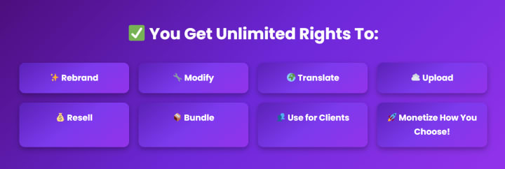 - Commercial resell rights to sell courses on your own platforms