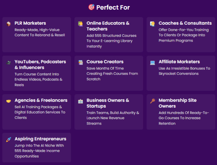 Ideal for: Digital entrepreneurs seeking affordable marketing courses for beginners to resell, coaches and consultants needing ready-made curriculum to offer clients, affiliate marketers wanting valuable bonuses to increase conversions, content creators building membership communities, and anyone pursuing passive income ideas with low investment who has basic marketing knowledge.