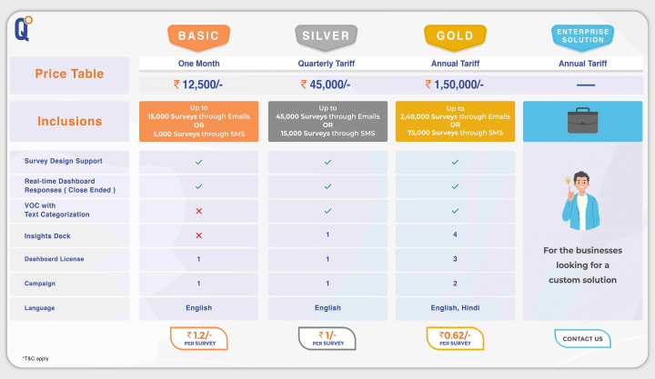 • Gold - The gold membership includes an annual tariff of 1 lac 50 thousand INR. This includes up to 2,40,000 surveys through emails or 75,000 surveys through SMS. It is available in English and Hindi, costing 62 paise per Survey. Along with the combined features of basic and silver, it offers four insight decks, three dashboard licenses, and two campaigns.