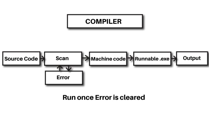 In compiler the source code is completely compiled by computer hardware and then execute. When there is no error on source it produces the result.