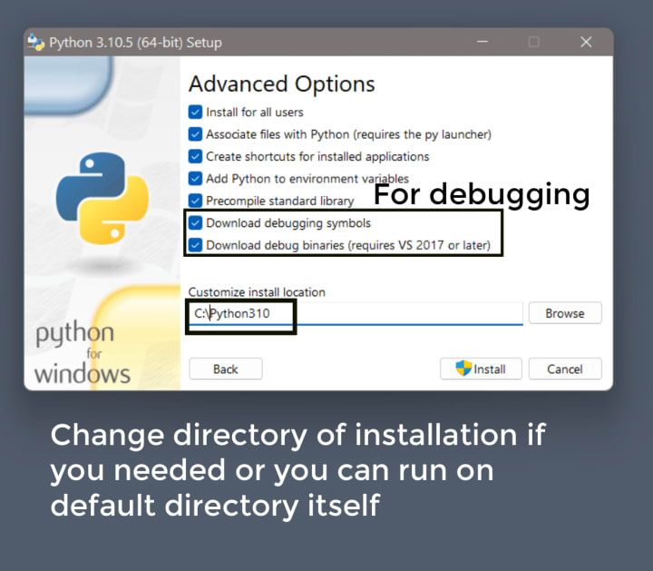 6. After next the screen appear like this, for debugging you enable the option and if you need to change the directory of installation you can change or choose default directory.