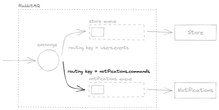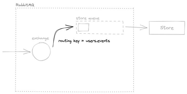 The format of the routing key is arbitrary. Using the key in the above format, we can declare that Store wants to consume events from Users by creating the binding between the exchange and the “store” queue with the key “users.events”. That’s all that it takes.