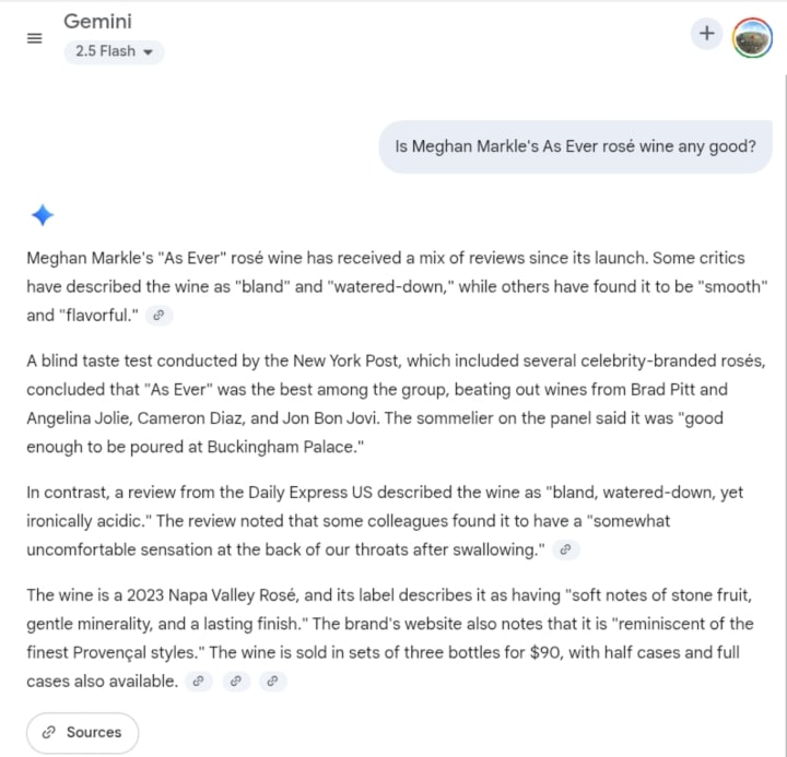 And of course in this digital age, AI must have its opinion. So I asked the opinions of Google Gemini, Microsoft CoPilot and OpenAI ChatGPT. Since they are all biased with what they can find online, I have decided to also have a biased pick because of what I can find in my human head. Which is the ability to easily understand well presented information which I found with Google Gemini. And for anyone wanting to do the AI comparison, the term used is "Meghan Markle rosé wine review".