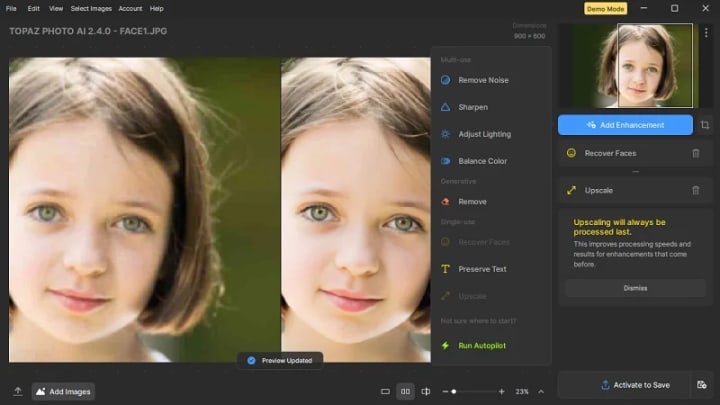 Topaz Photo AI is an advanced photo touch-up tool renowned for its superior quality. It offers various functions within the Add Enhancement board, including Remove Noise, Sharpen, Adjusting Lighting, Remove Objects, Recover Faces, and more. Once a photo is uploaded, users can select any function to apply to the picture, and the chosen enhancements will be displayed on the main screen. Notably, multiple functions can be applied to the same image simultaneously. For those uncertain about how to retouch their photos, the Autopilot feature analyzes the image and applies enhancements to bring out its best quality.