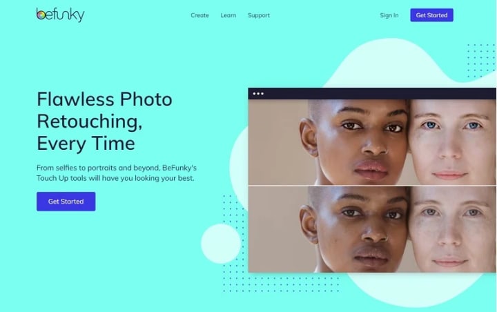 Befunky stands out as the most feature-rich among these three online tools, offering a diverse range of functions organized into 10 sections. These functions encompass basic editing features like rotation, resizing, and cropping, as well as facial enhancement and modification tools, filters, and various AI functions such as automatic enhancement. While its facial modification capabilities surpass those of Fotor, its AI automatic enhancement function is relatively average, primarily adjusting brightness and contrast without significantly improving image quality. However, Befunky excels in retouching facial blemishes, particularly in high-resolution images.