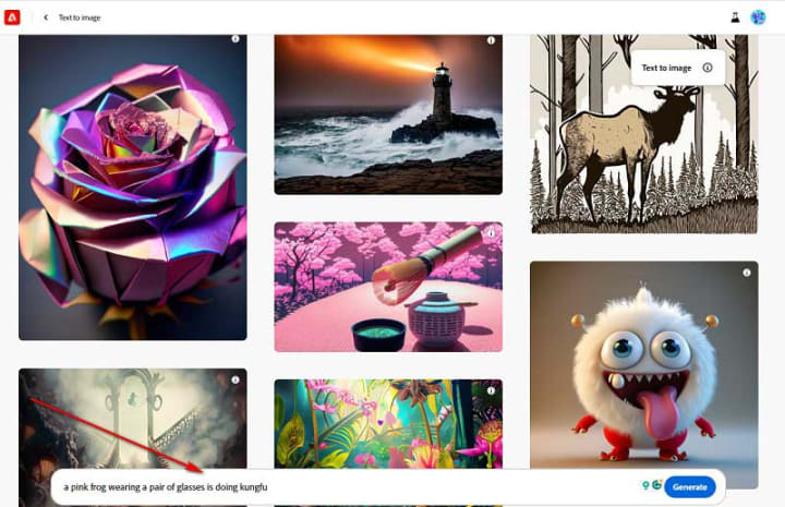 Within the "Text to image" feature, you'll find a collection of AI-generated artworks created by other users that can serve as inspiration. In the text box at the bottom, input a description of what you wish to create, and then click "Generate."
