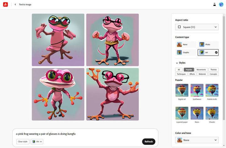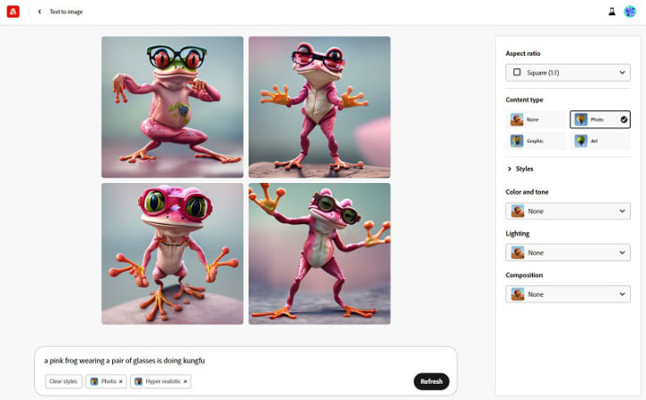 This action will produce four distinct images. On the left-hand side, you'll find settings that include aspect ratio, content type, styles, color and tone, lighting, and composition. By default, Firefly generates AI art, but you can customize all these settings according to your preferences.
