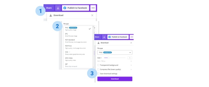 Once your design is done, you can choose to download or publish it. To download: click download, and choose the file type you prefer.