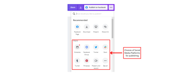 If you prefer to publish your design, click "publish your design" on Facebook, Pinterest, Twitter, or website. Click the arrow with Publish to Facebook (this might vary depending on how you signed up).