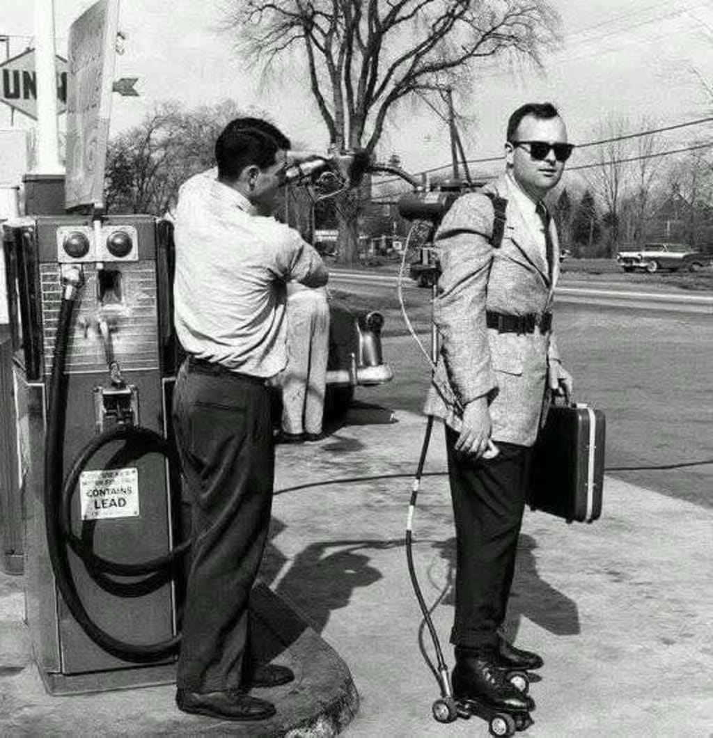 salesman has his motorized roller skates refueled. Connecticut, 1961.