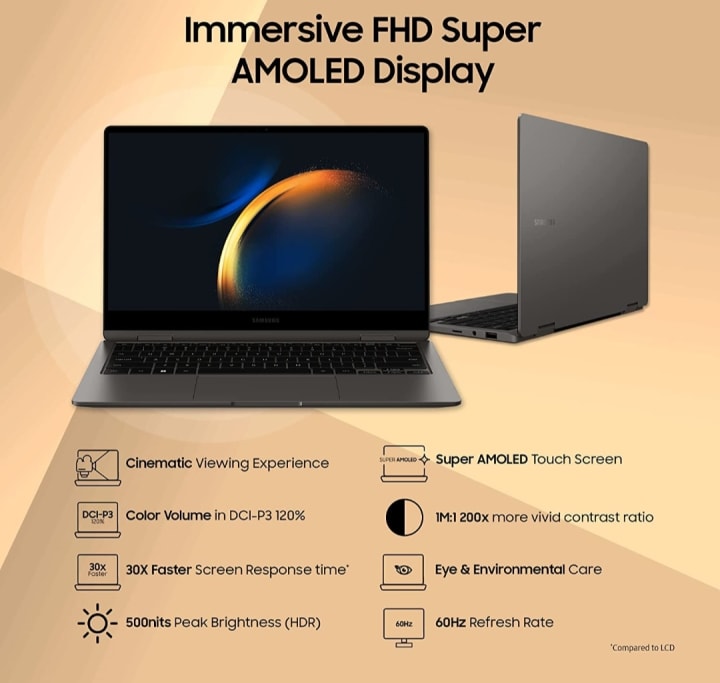 The 2-in-1 laptop can be used as a traditional laptop or as a tablet, depending on your needs. With its versatile design and advanced features, the Samsung Galaxy Book3 360 is perfect for people who are always on the go and need a device that can keep up with their demanding lifestyle.The 13th Gen Intel Core i7 processor, 16GB of RAM, and 1TB SSD provide a powerful and speedy performance, allowing users to multitask and handle demanding applications with ease. The laptop's Super Amoled display with a resolution of 1920x1080 provides vivid colors, sharp contrast, and excellent viewing angles, making it perfect for streaming, gaming, and work-related tasks.