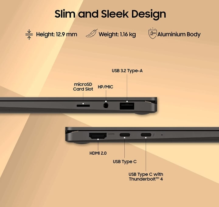 The Samsung Galaxy Book3 360 is a stylish and compact laptop that is available in a sleek graphite color. It weighs just 1.16Kg, making it easy to carry with you wherever you go. The laptop is designed to provide you with a smooth and responsive computing experience, with features that make it ideal for work and play.