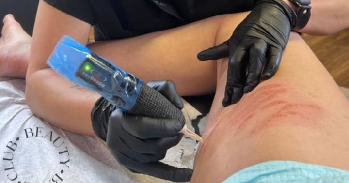Inkless tattooing is a technique used to improve the appearance of scars, stretch marks, and other skin imperfections without the use of traditional tattoo ink. This method involves using specialized tools to perform a non-invasive procedure that stimulates the skin's natural healing process. Rather than applying ink into the skin like in traditional tattooing, the technician uses micro-needles to create tiny punctures in the skin, which promotes collagen production and enhances skin texture.