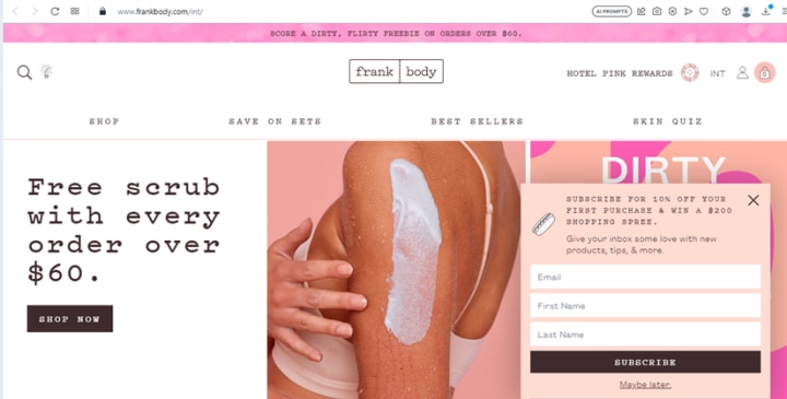 Frank Body is a unique coffee body scrub company produces body scrub that cleanses and exfoliates the skin. It strategically designed an opt-in pop up form on their homepage to promote 10% off from the client’s first purchase with an offer to win a $200 shopping spree. This not only captures visitor emails but also positions the business as a friend and giver.