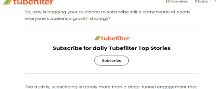 Tubefilter in the post, “stop asking your audience to subscribe,” inserted the subscribe CTA button to get viewers to like and subscribe to spend more viewing time on the channel. This strategy not only engages their social media audience but also expands their email subscriber base.
