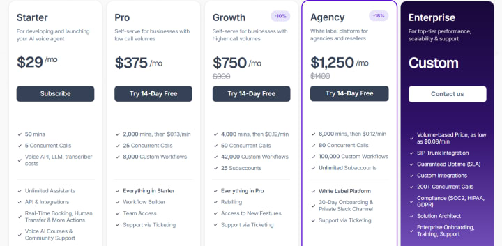 Starting at just $0.08 per minute, Synthflow offers a pay-as-you-go model. Need higher volume? Custom enterprise packages are available.