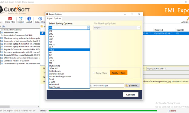 EML is a popular file extension designed by Microsoft. Various email clients such as Mozilla Thunderbird, Windows Mail, Windows Live Mail, Yahoo Mail, Turnpike, DreamMail, Outlook Express, eM Client, Eudora etc. support this format. User can simply open EML file with internet explorer or a text editor. EML files includes the plain ASCII text for headers and the main message body, hyperlinks as well as attachments. Whereas, MS Outlook saves its data in PST format. Microsoft Outlook is flexible as compared to EML file. Many of the organizations are willing to import, convert or save EML file into Outlook.