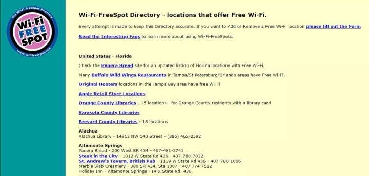 This option is of limited utility if you're looking for free internet at your home, but you might just get lucky. Wi-Fi Free Spot is a directory of businesses, organizations, and other entities that offer free Wi-Fi access.