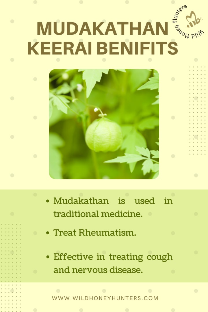 Antipyretic Properties carefully packed in it which cures the fever and cold used to treat many types of fever, apart from these properties it also helps in following, used to treat stiffness in Limbs, it also plays a significant role in treating ear pain, It is a great medicine to treat Gastric related problems such as Stomach pain, Constipation, Piles it also has Anti-diarrheal properties which cure diarrhoea. It serves as medicine for menstrual cramps and pain, as a relaxing agent, and, in general, as Tiredness relieving medicine and has more health benefits. And finally, Mudakathan Keerai also acts as Mosquito repellent, which protects us from mosquitoes when we apply the raw leaves extract to our skin.